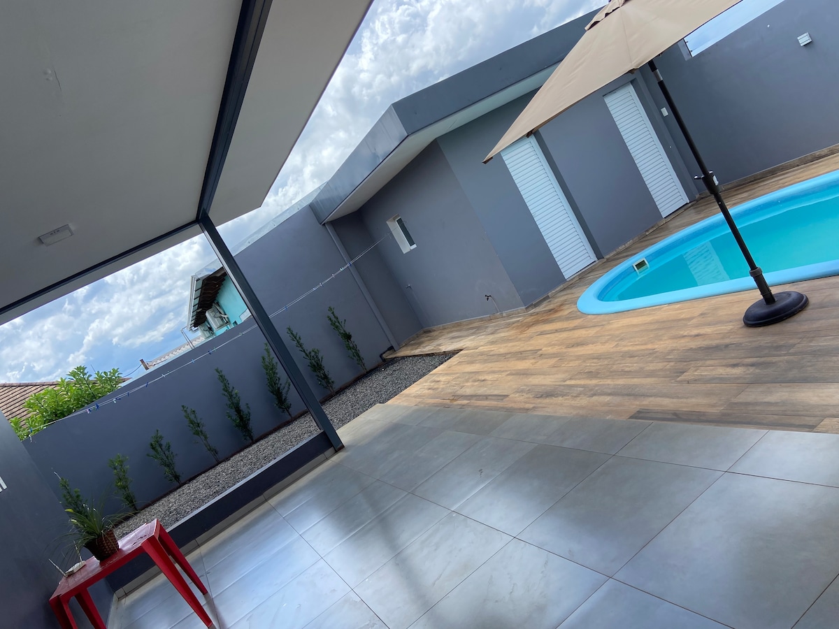 I worked for many years traveling, and over that time I learned what is needed when we are away from home. Every detail was designed for comfort, tranquility and a warm welcome upon arrival. High-end neighborhood, gated community with monitoring. It has a queen size bed, with pillowtop, hot-cold air conditioning, TV with Max, Prime and Globoplay. Full kitchen (water filter, air fryer and Dolce Gusto coffee maker). Covered garage. Bathroom with hairdryer, hair straightener and amenities. Welcome!