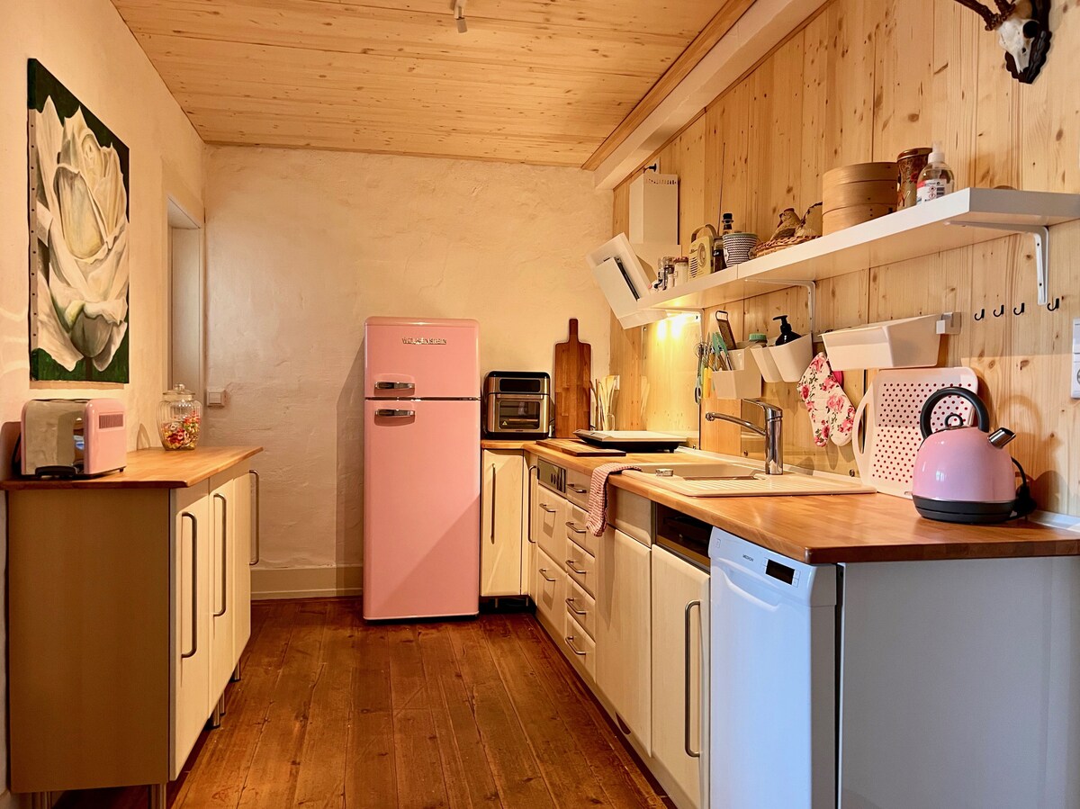 The "Kanne" is a lovingly restored half-timbered house in the heart of Trichtingen. The long-vacant building was renovated with great care for its historical structure and insulated with eco-friendly materials. A photovoltaic system supplies electricity for infrared heating, hot water, and lighting, creating a healthy indoor climate and authentic charm. The suite offers two individually designed bedrooms with large double beds (200 × 180 cm) and a calm, relaxing atmosphere.