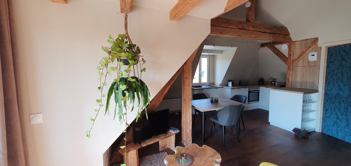 Enjoy a romantic escape in our charming 4-star loft in the heart of Barr, nestled in the courtyard of an 18th-century Alsatian half-timbered house. This spacious and fully equipped haven offers an open-plan kitchen, a cozy living area, a queen-size bed, walk-in shower, separate toilet, dressing room, air conditioning and Smart TV. A tandem is available for two, as well as a charging station for e-bikes and a private garage. A unique, refined, and welcoming place for a truly special stay.