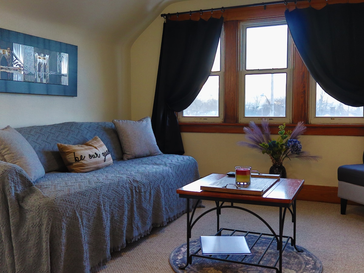 This spacious and naturally well-lit apartment comfortably fits two and has an optional bed-height air mattress that fits 2 more. It is 11 minutes from the Canadian border, 12 minutes from downtown Buffalo, 12 minutes from the University of Buffalo, 14 minutes from KeyBank Center and the Buffalo Convention Center, 17 minutes from the airport, 20 minutes from Niagara Falls, and 25 minutes from the Buffalo Bills stadium. PLEASE PURCHASE TRAVEL INSURANCE IN THE WINTER MONTHS; THIS IS BUFFALO!