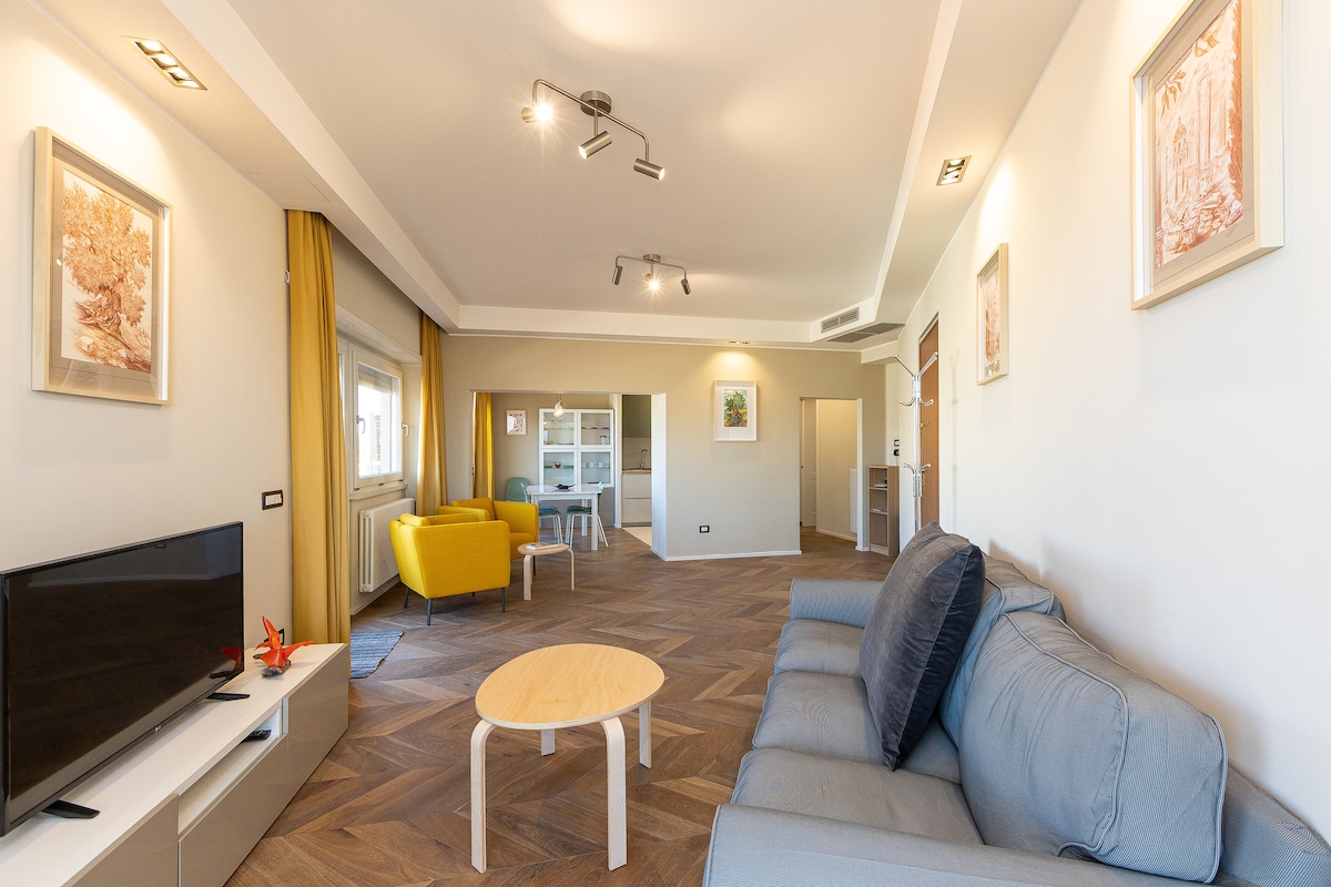 Nestled within a historic building facing one of the most iconic squares in the world, this one-bedroom apartment is located on the first floor and boasts modern amenities and an enviable patio, perfect for alfresco dinners. Ideal for couples or small families, the apartment features top-notch A/C system in all rooms, multi-room wireless sound system, steam bath as well as bathtub . Step outside the front door to toss your coin and immerse yourself in the lively atmosphere of the city center.