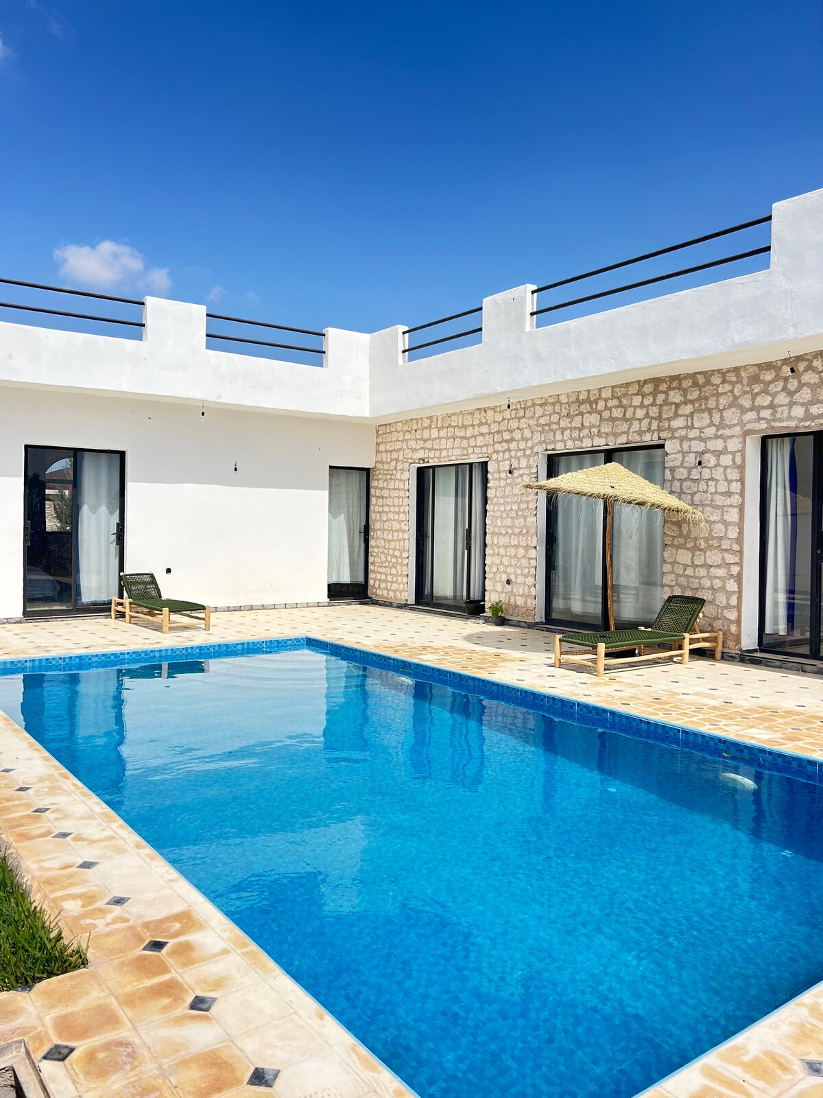 Welcome to "Langban Lanting", a private beachfront villa located next to the second beach in Sidi Kaouki, Morocco.This is more than just a place to stay, it's a complete vacation world designed for groups and families. The villa has 6 bedrooms, 4 bathrooms, and can comfortably accommodate up to 14 people.Just a few minutes walk to the best surf spots in the area, then back to your private paradise: swim in the large pool, play on the standard tennis court, or enjoy Moroccan specialties cooked by the housekeeper in the outdoor oven and barbecue area. We provide 24/7 attentive service: nannies and cooks are responsible for cooking and cleaning, and doormen and guard dogs ensure safety.We can also arrange a customized vacation experience for you, including car rental and airport pick-up, home essential oil massage, and a variety of activities: horse riding on the beach, camel riding, quad biking to explore the desert, or a Moroccan cooking class.Whether it's a dinner under the stars at night or listening to the waves in a hammock, it's a place where all your seaside holiday fantasies come true. Stylish, private, and well-serviced, Langpo Blue Court is ideal for surfers and group gatherings, and we hope to create a complete and unforgettable memory for you.