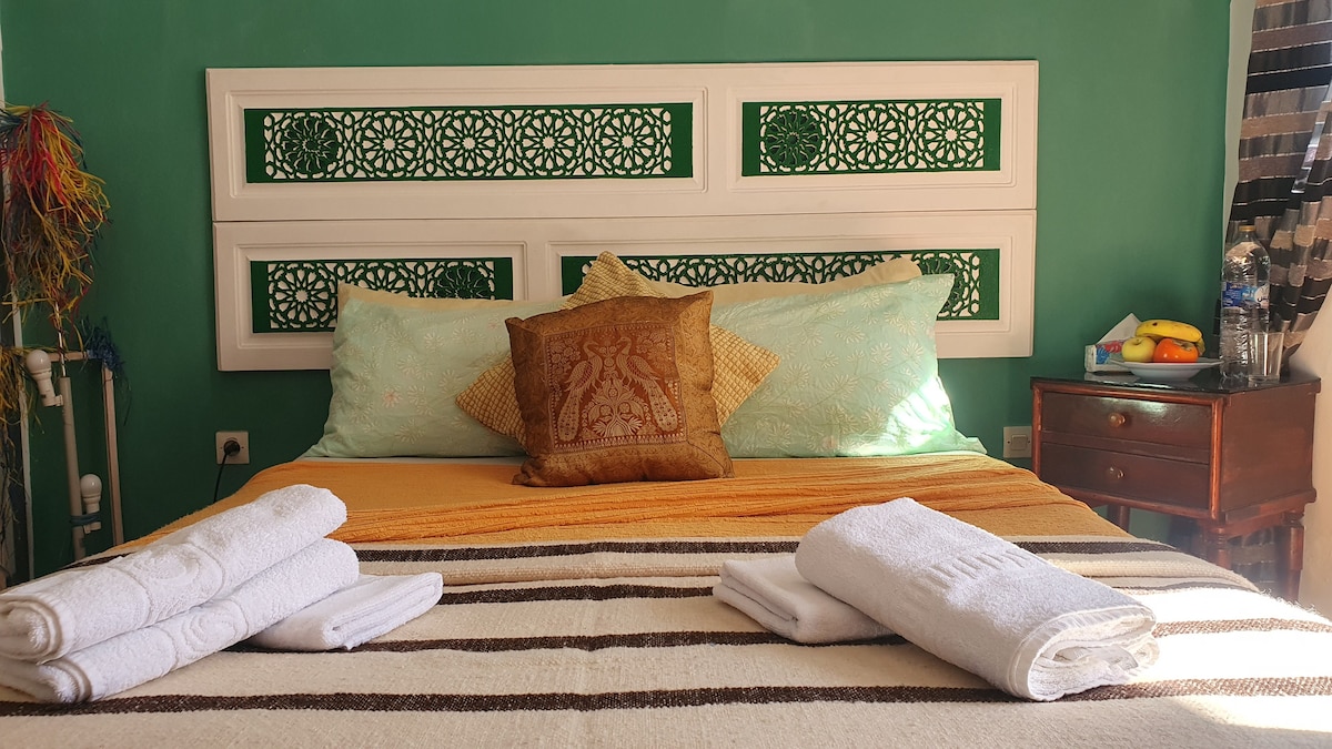 This apartment is decorated in a traditional Moroccan style, featuring a private bathroom, a kitchen, and a furnished terrace with views of the medina. It also has a separate bungalow (twin room) located outdoors on the garden terrace. If booked for only 2 people, they will have access to the double room only. Access to the twin bungalow requires an additional fee of 30€ per night — For bookings of 3 to 4 people, the twin room is automatically included at no additional cost