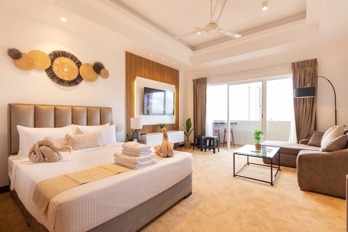 Start your mornings with coffee on your private balcony, savoring the stunning ocean views and the vibrant energy of Negombo. After a restful night in your comfy bed, unwind in the cosy TV lounge with free Wi-Fi, air conditioning, and 24/7 security providing all you need for a worry-free stay. Take a dip in the rooftop pool, dine at the on-site restaurant, or explore nearby cafes and seafood spots. Our apartment perfectly blends relaxation and convenience for an unforgettable stay in Negombo.
