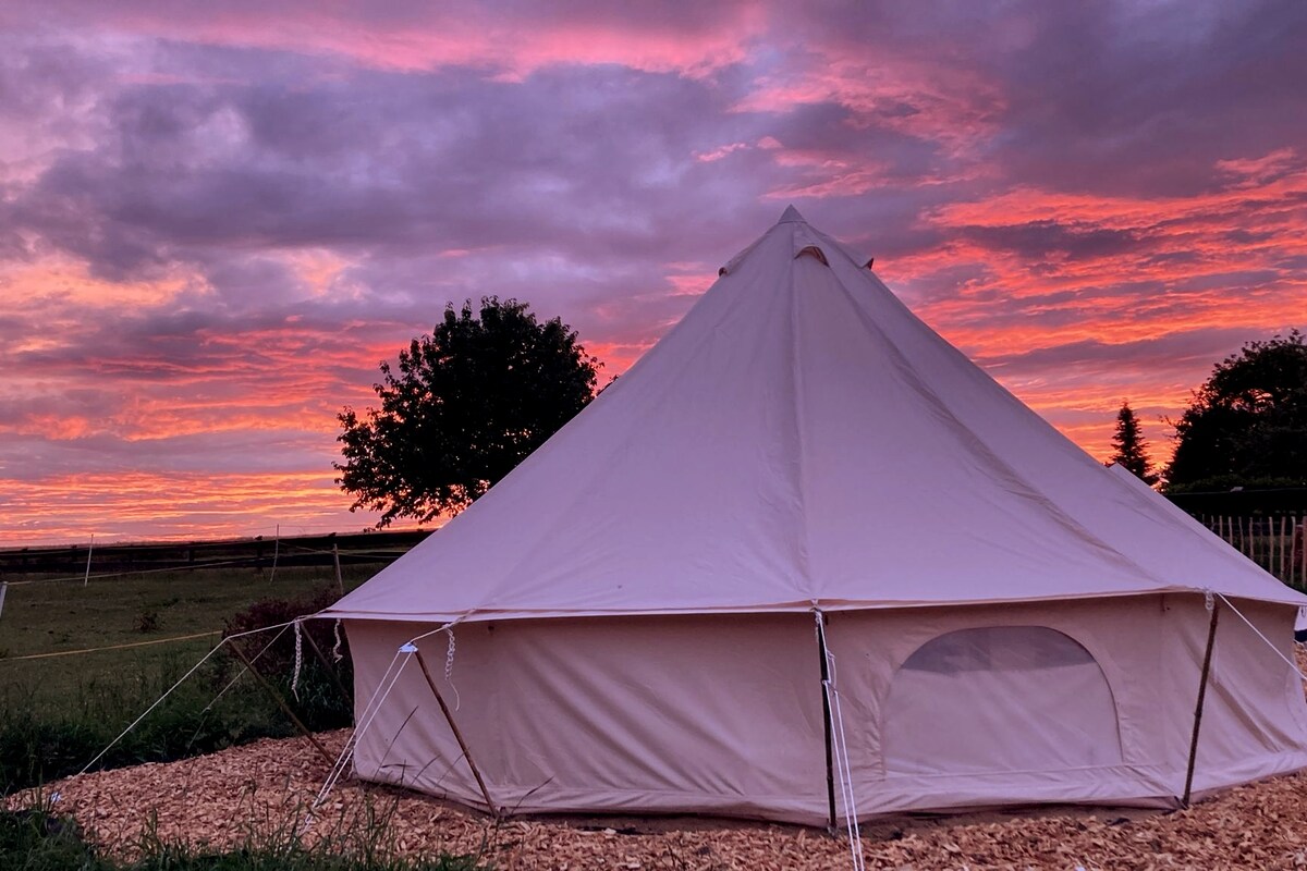 Our bell tent with super-king bed & luxurious bedding is perfectly located amidst wonderful countryside. There are many activities, places to see & events locally. Walks are directly from the tent. The local pub, serving home made food & local ales, is a 3-minute walk away. We provide a separate kitchen with induction hob, fridge/freezer, Lavazza coffee machine, BBQ, microwave, kettle & toaster. All on your own private area of land for you to use exclusively. Dogs welcome (for a small fee).