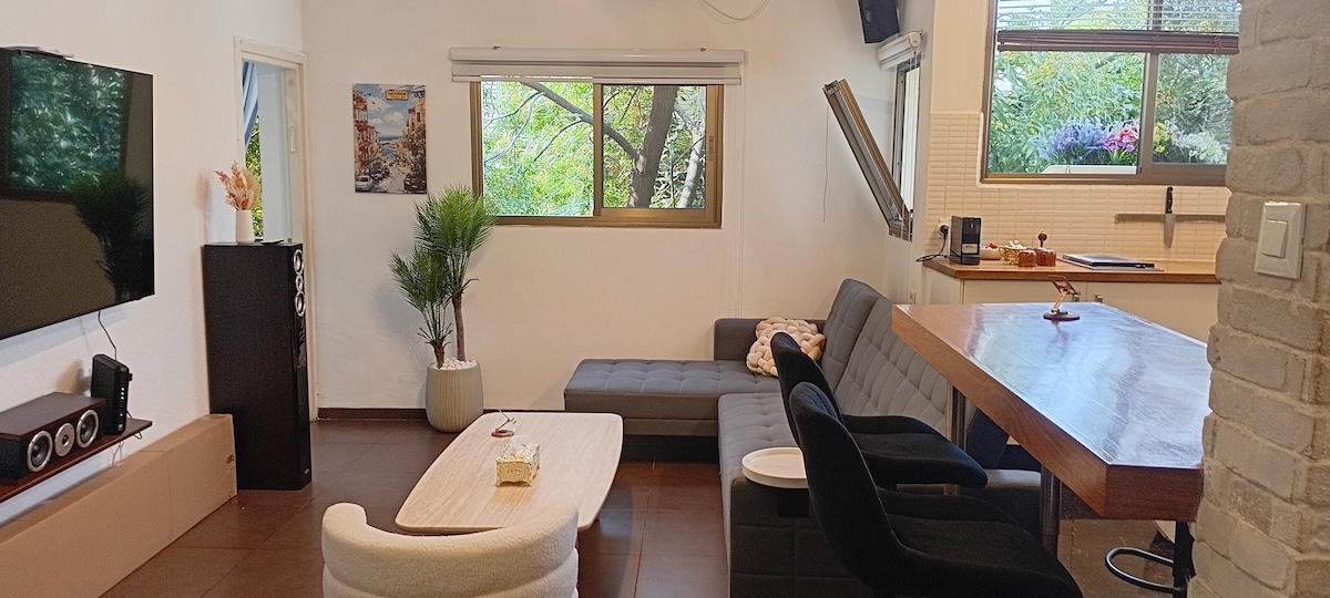A small village in the heart of the city. A few minutes from any central location in Tel Aviv. All the guests say that in reality it is much more beautiful. And it's fun to stay there. A spacious wooden terrace surrounded by trees, with a pergola and covered for year-round use. Two bedrooms, a fully equipped kitchen, and an underground shelter in the building