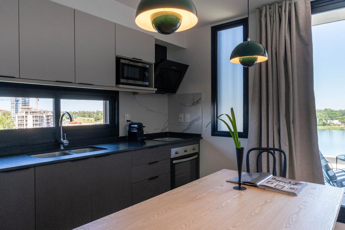 If you are looking for a different stay in a privileged area, our apartment will be an excellent option. It is located in a new building in front of a beautiful lake, just 3 minutes from Montevideo, 5 minutes from the Airport. This super bright designer apartment offers a quiet and safe atmosphere, in an environment of lakes, green areas and ocean views. The building offers a solarium with a heated outdoor pool, 24-hour virtual security, and a garage corresponding to the unit.