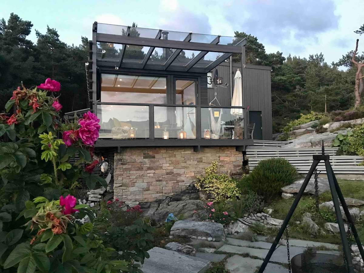 Lyst og eksklusivt feriehus med høy standard med fantastisk utsikt og svært gode solforhold. Grenser til ett eventyrlig friområde. Båtplass medfølger. Perfekt utgangspunkt for tur til Preikestolen, Kjerag og Lysefjorden. Store vindusflater og med utgang til stor terrasse fra tre glassdører. Pergola er overbygget med glasstak. Hagemøbler, gassgrill og bålpanne medfølger. Rett nedenfor feriehuset (120 meter) kan du sitte på svaberg og se solen gå ned i havet. Gode fiskemuligheter.