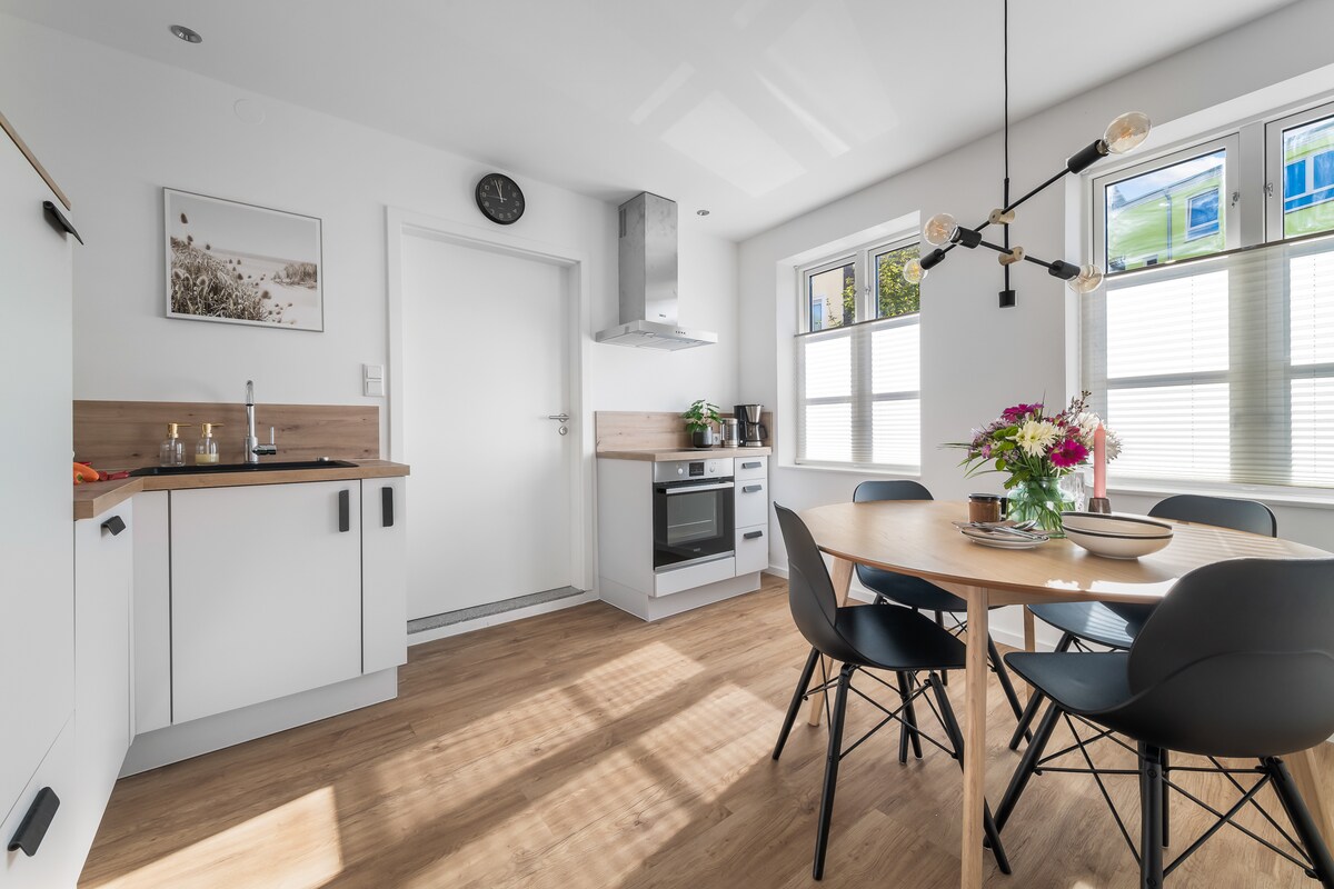 Welcome to Leneshus in the heart of Flensburg! This lovingly refurbished apartment (2022) accommodates up to 4 people and offers everything you need for a comfortable stay. The bedroom features a high-quality box spring bed, and the cozy sofa bed provides space for two additional guests. A bright kitchen and dining area seamlessly flows into the cozy living room. A small backyard offers space for storing your bicycles and relaxing. A parking spot is available. 10 min. walk to shops and harbour.
