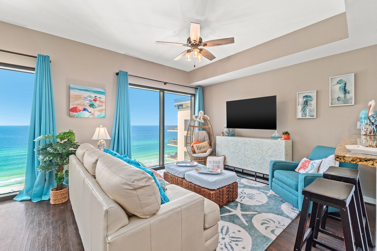This stunning beach condo is conveniently located on the 12th floor of the beautiful Shores of Panama Resort in Panama City Beach, FL. Enjoy this beachy retreat with new quality furnishings throughout! You will find STUNNING gulf and pool views from the living room, kitchen, master bedroom and large balcony. This resort boasts a 14,000 square foot Lagoon Style Pool, an over-sized outdoor hot tub, waterfalls, fountains, a tiki bar and grill and exotic tropical landscaping and more inside!!!
