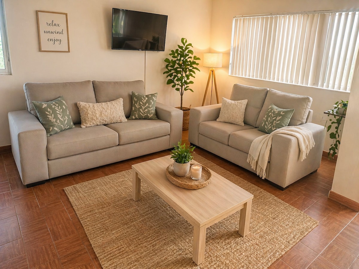 New, modern and fully equipped apartment with two bedrooms — both air-conditioned. The living room is cozy, the kitchen is functional and the bathroom is elegant. Located in Achada São Filipe, just 5 minutes from the sea of Fonte Bila. Ideal for vacations or business trips, the space offers excellent natural light, a quiet environment and amenities designed for your comfort. Perfect for couples, families or professionals on a stay.