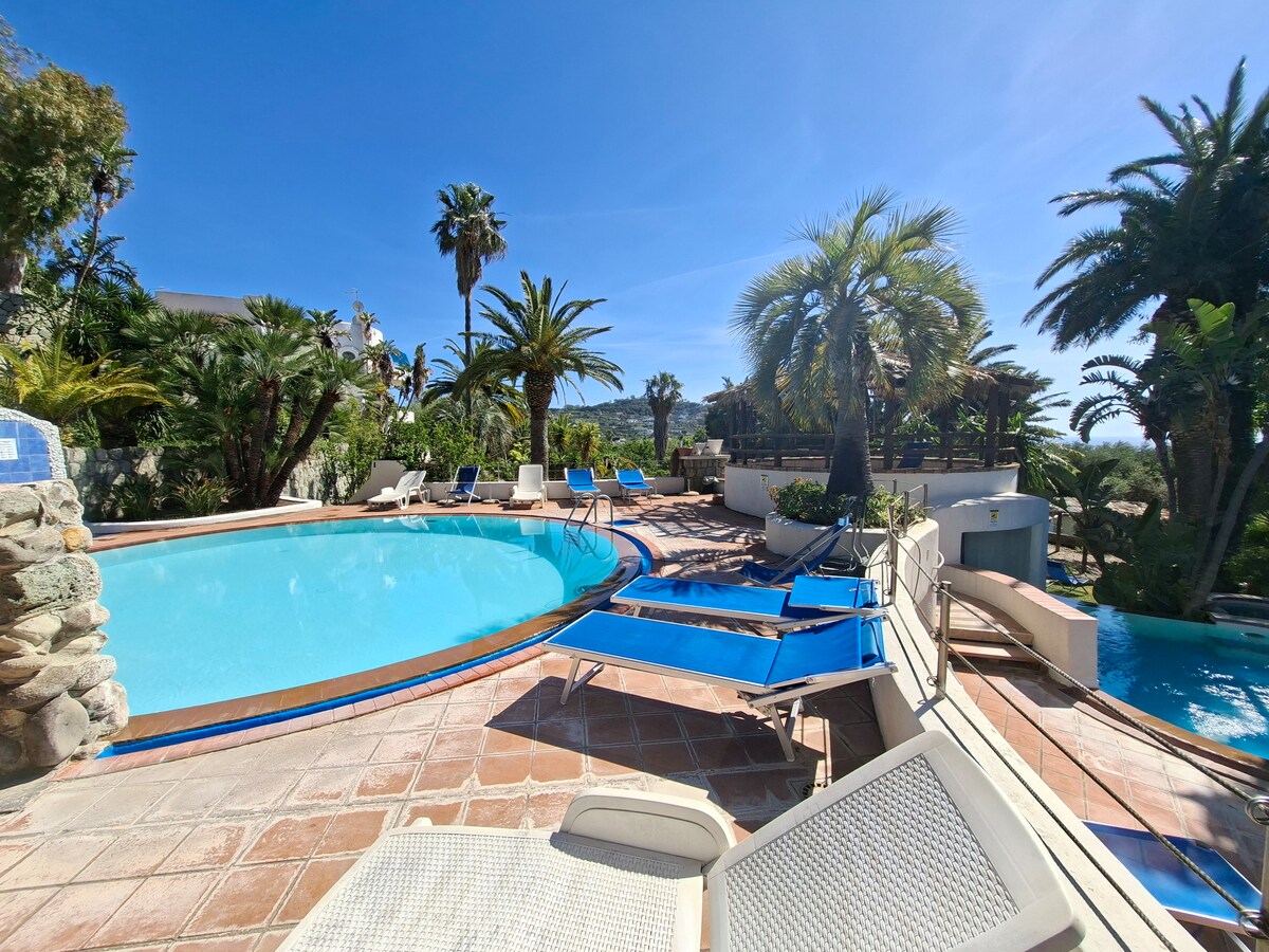 A thermal pool, a natural sauna. An exclusive villa immersed in a lush garden, suspended between sky and sea. In the enchantment of the Bay of Citara, one of the most evocative on the island because it is entirely exposed to the west: dreamy sunsets with the red sun that goes out in the open sea behind the island of Ventotene, the only obstacle to the wide-open gaze on the immense horizon. Six double bedrooms, fresh, panoramic, each with its own bathroom, fans, and mini fridge.