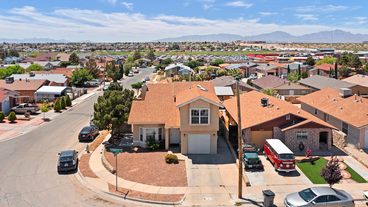 Experience the vibrant Mexican-American culture and its warm hospitality in this updated, open-concept home. Whether you're in town to work, relax, or play, this spacious 3 BR/2 BA home with game room, 500+Mbps, refrigerated AC, king suite & gourmet kitchen has it all. Relax by the fire table or hammock pergola in the NEW backyard retreat w/basketball court & pickleball! Close to I-10, airport, UTEP/UMC/downtown/FtBliss/HuecoTanks/eats/parks/shops. We look forward to welcoming you. ¡Bienvenidos!