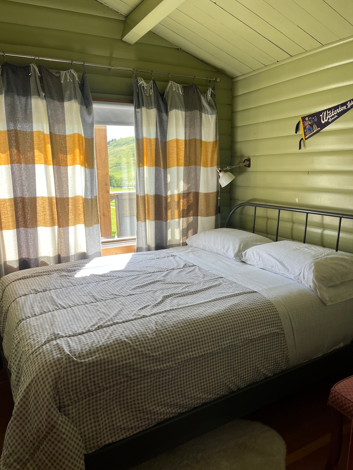 This is a new cabin nestled among huge willows with an amazing view of the Rockies in the distance. There’s a vintage clawfoot tub and shower outside on the deck, and a new compost outhouse tucked behind at the back of the cabin, how cool is that! Inside is a comfy king bed with soft linens, antique table and chairs, microwave, French press coffee maker , toaster and a BBQ outside. There are lots of lovely shade trees and fire pit area for your own picnics.