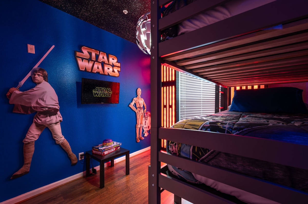 This modern 3-bedroom luxury condo (with an ELEVATOR right to the door) has one of the most PICTURESQUE VIEWS in the Reunion Resort of the Arnold Palmer PGA golf course. Combining STYLISH DESIGN and LUXURIOUS COMFORT, there are 2 KING bedrooms and a playful STAR WARS themed bedroom with a classic Arcade machine & Xbox. 4 TVs with DirecTV, free high-speed wifi, your own washer & dryer, access to 6 resort pools, 2 of which are only a 3 minute walk away, and only a short drive to Disney.