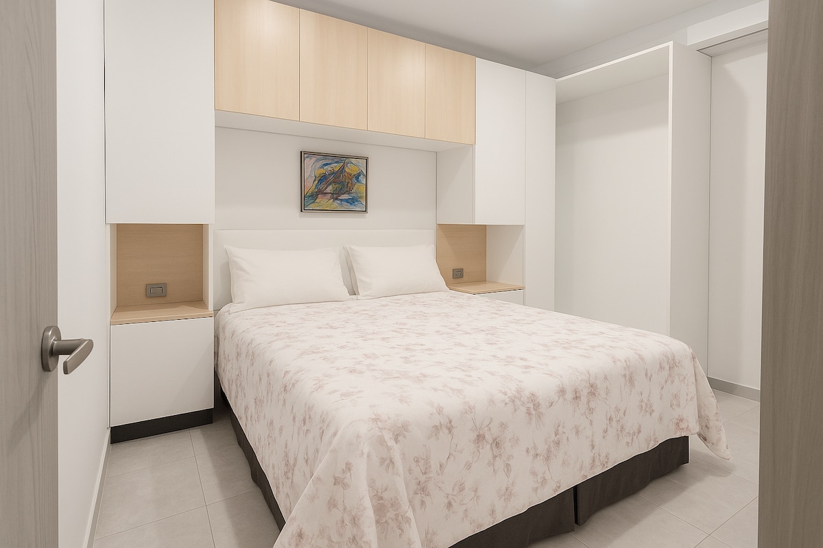 Apartment with a modern and functional design, with warm and elegant decoration. It has three (03) bedrooms each with a private bathroom and walk-in closet. Two (02) bedrooms with a Queen bed and one (01) bedroom with a Twin bed and a work area. It has a guest bathroom and a private balcony with panoramic views of the city. The kitchen is equipped with utensils, pots, dishes, wine glasses, glasses, microwave, coffee maker, blender, stove, oven, refrigerator and freezer.