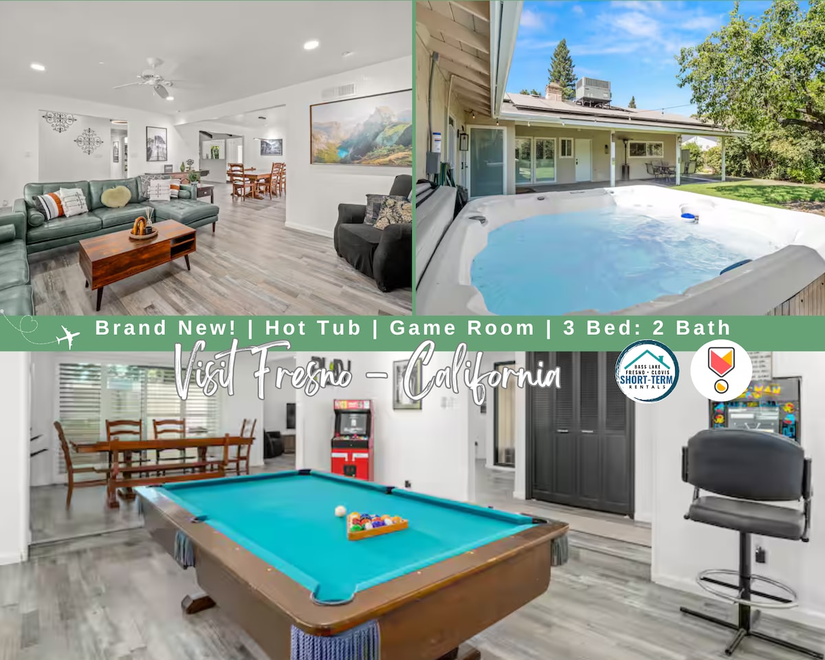 Newly renovated home with exquisite modern design and relaxing outdoor hang-out space plus a BRAND NEW Hottub! Located in a welcoming residential neighborhood while within walking distance of stores & restaurants! Easy access to the highway and close to CA 168 - less than 5 min drive and Yosemite Int'l Airport -11 min drive! Nearby areas for fun activities are: -Bulldog Stadium 8min. -500 Club Casino 3min -Blackbeard's Family Entertainment 6min -Valley Golf Center 19min -Old Town Clovis 7min