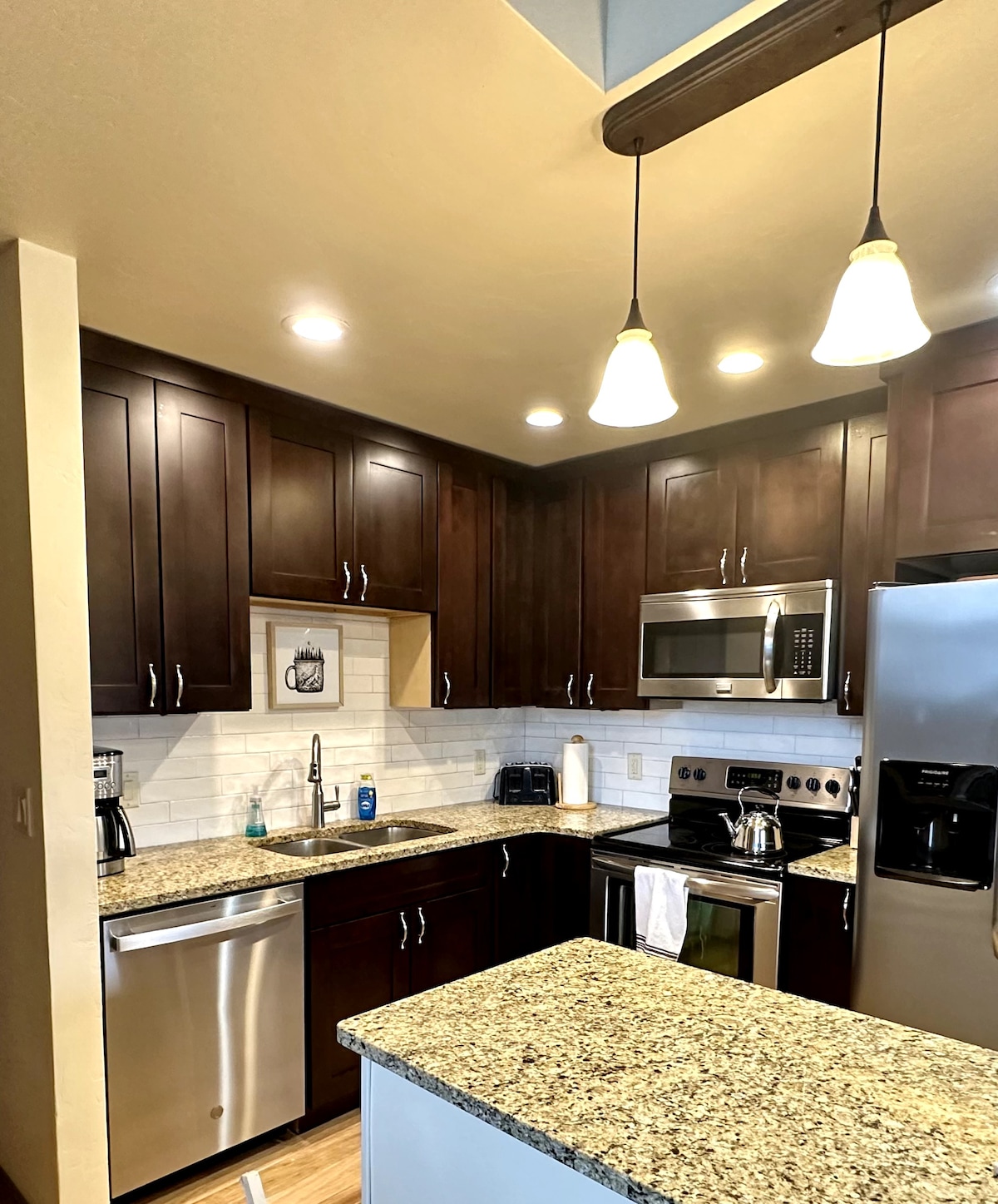 Main Street convenience meets mountain adventure! At our condo your <1 minute walk to the free Summit Stage Ski bus and also to charming Frisco Main Street for restaurants, coffee and shopping. Aprés-ski finds its perfect setting back at the condo, with two cozy bedrooms, dual headed master shower, blackout curtains, newly remodeled kitchen, wood burning fireplace, sunken living room framed by mountain vistas, private, ground level back porch w seating, washer/dryer, 2 dedicated parking spots