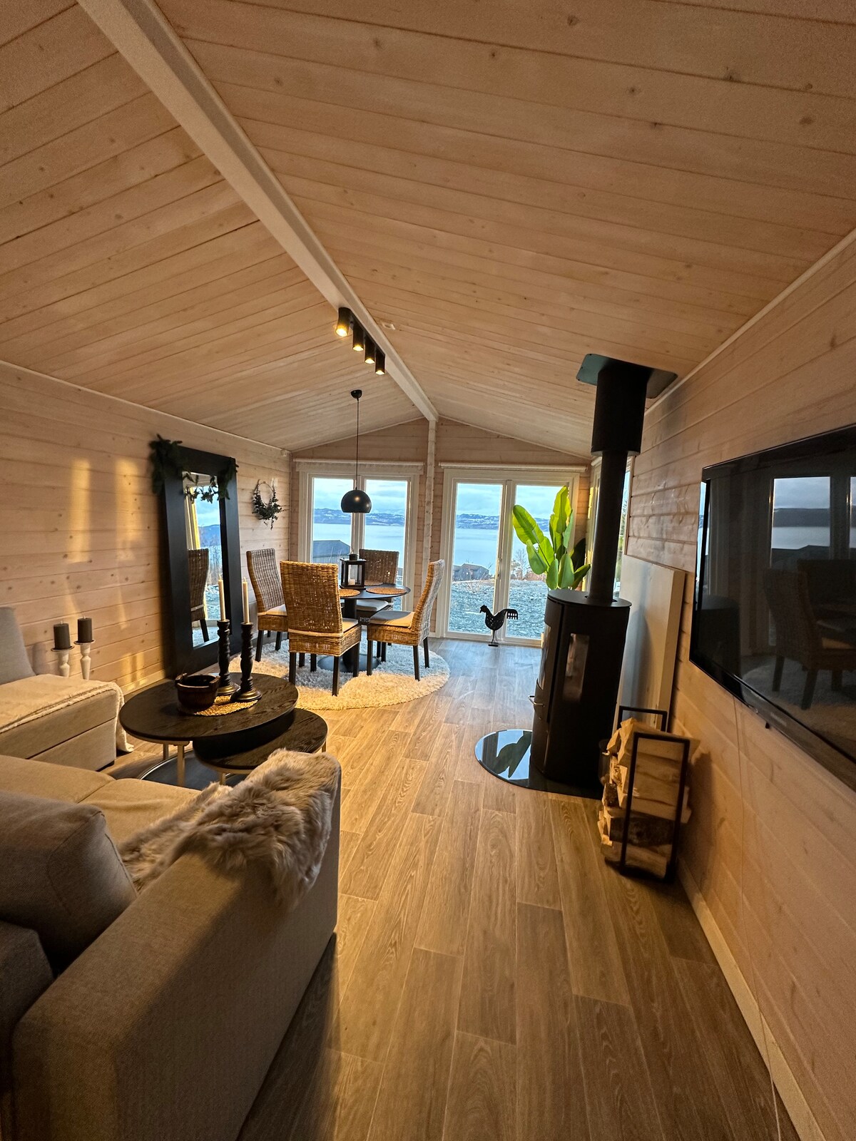 This tiny house is located 50 m away from the beach and Frosta Brygge restaurant. You will find what you need for a nice and comfortable stay. Bedroom with a 1,50 bed and a drawer. Bathroom with shower, toilet and a faucet. Kitchen with dishwasher, fridge, oven and stove. Dishes and all the equipment you need to make a good dinner. Living room with a sea view, fireplace and sofabed. Three door that can be opened to a deck with outdoor furnitures. Wifi and TV Linen and towels included.
