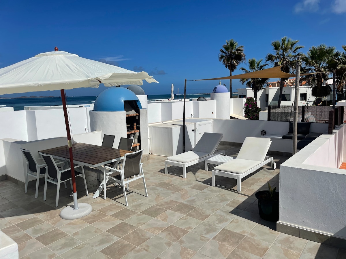 Fully refurbished bungalow boasting a large private roof terrace with sea views of Lobos and Lanzarote. Large quiet communal beachfront pool and paddling pool. (Just fully renovated). Situated within a small gated beachfront complex next to the popular surf spot 'Punta Elena'. We bought this property end september 2021 while it had 114 reviews with an average of 4,87 and hope to even improve this to make your stay a “memorable experience”