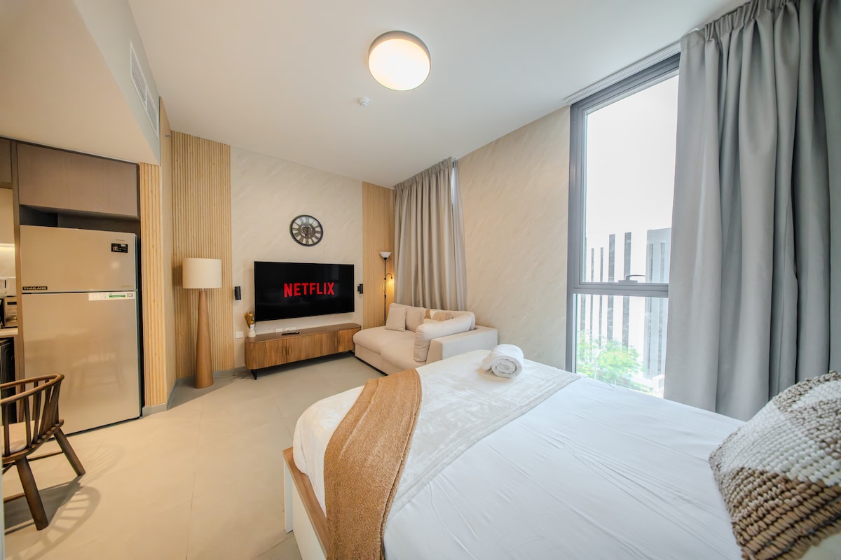 - Located in Boulevard building of AlJada Sharjah - Poolview - Big Sized Studio - Carrefour and Coffeeshops/Restaurants downstairs - Center Hub of Sharjah - Free Wifi and Netflix - Free Private Parking - Sofa can accommodate 1 person. - Pool & Gym access included. - All kitchen Utensils included along with Gas Oven - Bathroom Amenities and Towel included - Iron / Washing Machine / Iron stand / Dry stand included - Kids play area downstairs