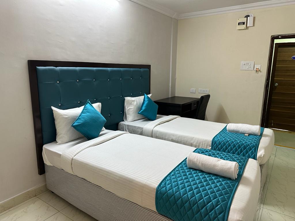 The Triple Sharing A/C Room with great ventilation offers three comfortable beds, a private bathroom, and access to an open terrace. Guests benefit from high-speed WiFi, Smart TV, an instant 10L geyser, electric kettle with coffee/tea sachets, 24/7 power backup, and direct lift access. Suitable for up to three members, it is ideal for long stays, medical visitors, and group travelers.