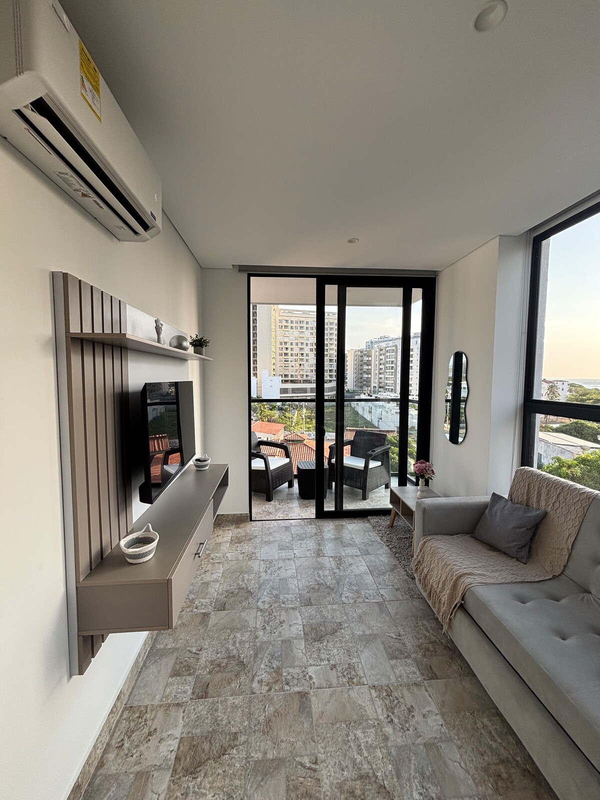 Charming luxury suite in Santa Marta, ideal for couples, families or travelers looking for comfort and an excellent location 🌴. It has a modern design, fully equipped kitchen, king size bed, sofa bed and private balcony overlooking the mountains, perfect for relaxing. The building offers 2 swimming pools, a gym, pool table, ping pong, coworking, spacious lobby and 24/7 security. Only 15 minutes from the airport and close to Mall Arrecife, supermarkets, restaurants and beaches ✨🌊