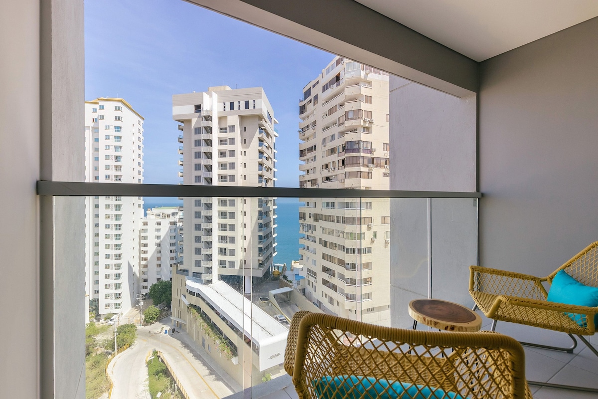 Espectacular apartamento moderno para estrenar en un piso 17 con vista al mar y salida directa a la playa. Espacio agradable para tomar vacaciones, descansar y/o trabajar home office. A 10 minutos del aeropuerto internacional y del centro histórico de Santa Marta, cerca a zona de restaurantes, bares, centros comerciales y farmacias. A menos de una hora del Parque Nacional Tayrona, Taganga, Minca. El apartamento cuenta con un amplio balcón donde podrás disfrutar del mejor atardecer de Colombia.