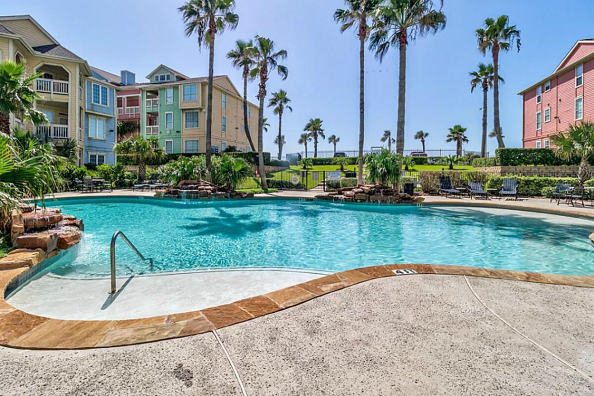 We invite you to enjoy a Beautiful large condo in a gated community across from the beach. Two resort style pools, jacuzzi, kid's pool, 2 picnic & BBQ areas. Fitness center with 24-hr access. Minutes away from restaurants, shopping, Schlitterbahn, Moody Gardens. Walmart 5-min walk across the street. Very quiet. This is the place you want to stay at - luxury living on the beach! Month-to-month rental available.