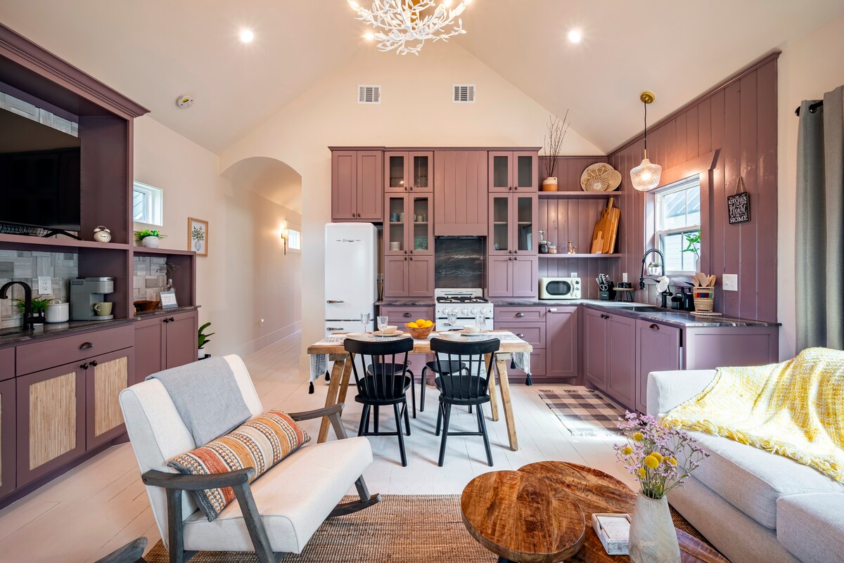 The perfect getaway with all the amenities of home! This backyard tiny house is the perfect spot for 2. Queen bed, kitchenette with Coffee, microwave, and mini fridge. We also provide dishes for your takeout. Smart Tv. WiFi also makes this the perfect spot to social distance and work on vacation if needed. Tables by couch for eating or work. Though backyard is shared with guests from front house it is very lush and has multiple sitting spaces for your own privacy.
