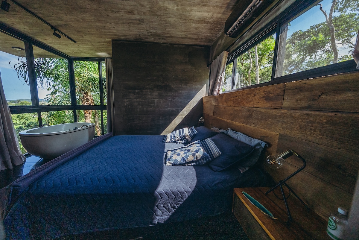 Welcome to Refúgio Vista da Montanha, in the city of Imaruí - SC (1:30 from Florianópolis). The Banana Tree Cabin is perfect for couples and is equipped with everything you need to live days of comfort and contact with nature. It features a full kitchen, Wi-Fi, fireplace, sofa bed, double mattress on the mezzanine, air-conditioning, movie projector, Alexa, floor fireplace and heated whirlpool tub! - 1 hour from Praia do Rosa; - 5 km from waterfalls. ** Pet Friendly **
