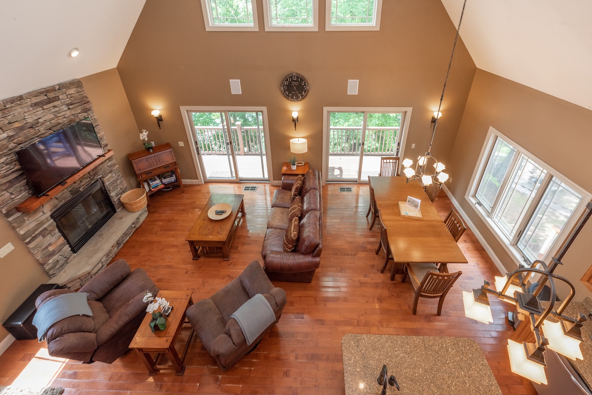 Bring the whole family and enjoy a large level lot with a firepit and cornhole boards. Your dock slip is a short 2 minute walk with a beach cart to help get all your necessities to the lake! Come back and hangout on the back deck with space to conversate, BBQ and dip in the hot tub! The loft has an oversized beanbag and foosball table along with two separate living areas! End the night in front of the large stone wood burning fireplace watching a movie!