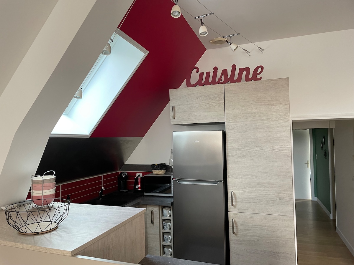 Charming bright 45 m² two-room apartment – Center of Saint-Quentin This beautiful 45 m² two-room apartment combines old world charm with modern comfort. You will enjoy its bright living room with parquet flooring, its desk area, and its cozy TV area to relax. The apartment also includes: • A fully equipped kitchen • A comfortable bedroom • A functional bathroom Close to shops, restaurants and train station, it is the ideal place for a business or tourist stay in Saint-Quentin.