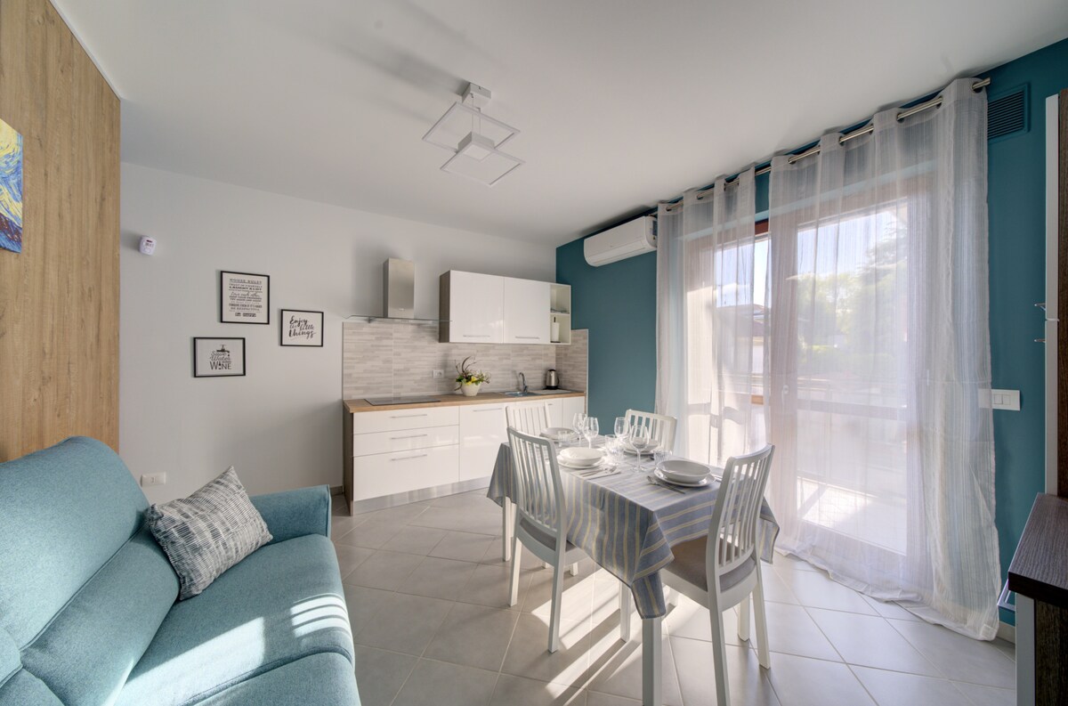 60 sqm studio, recently renovated, quiet area surrounded by nature. The living area is bright thanks to the windows overlooking the garden, furnished with a sofa bed, peninsula sofa, 48" TV, dining table and closet. Fully equipped kitchenette with state-of-the-art appliances: fridge, oven, microwave and dishwasher. Private parking with an automatic gate. It is a 5-minute drive from the center and 2 minutes from the hospital.