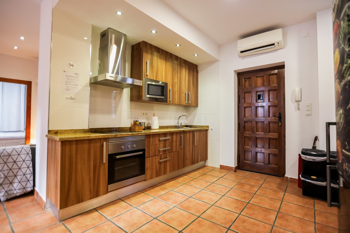 Nice apartment in the heart of Granada, in the Realejo neighborhood, in a house with the charm of the old houses in the neighborhood. In the heart of the city, a 5-minute walk from the Cathedral and 15 minutes from the Alhambra, and a bus stop at the door. Bar and drinks area. With 2 bedrooms, one with a 150 double bed and another with a trundle bed, sofa bed and separate patio. It has air conditioning, heating, and a pellet stove. Good accessibility with only 2 steps to access the house.