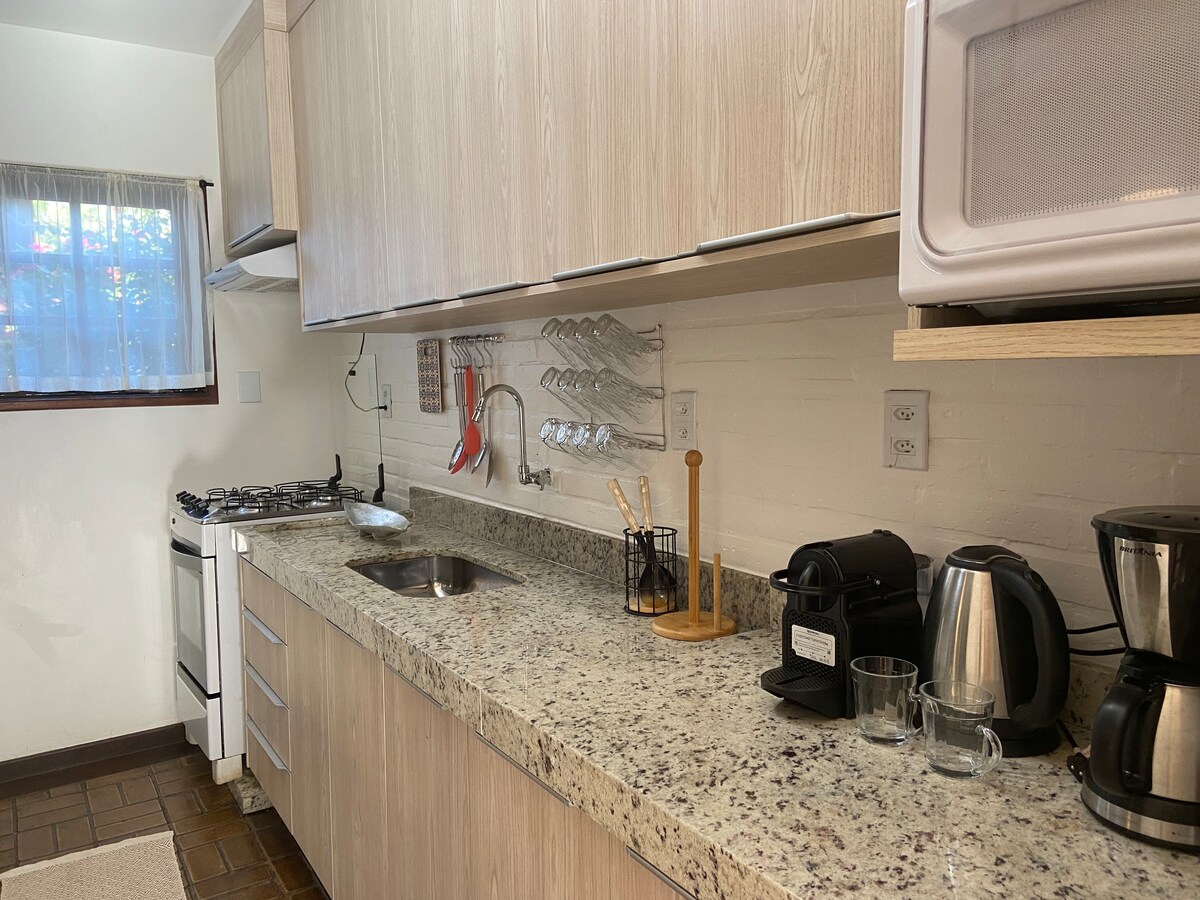 House in prime area, 1-minute walk to the beach, quiet place with good air circulation (doors and windows with mosquito net), large bedroom with closet, queen size bed, split air conditioning, 100% cotton sheet and bath towels with organic cotton. Dishwasher, Wi-Fi, Smart TV and garage inside the house. Pets allowed. Perfect space for your rest and leisure.
