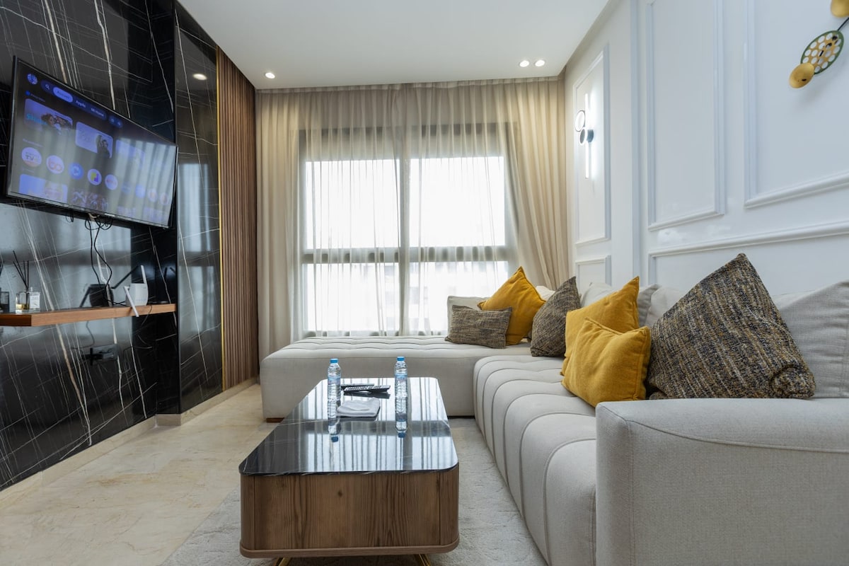 Perla 403 💎, a haven of peace where the elegance of a modern residence is combined with the comfort of 5-star hotels in the heart of Casablanca! Relax in a spacious living room with a modern design, equipped with a 55" Smart TV with Netflix and IPTV for evenings of absolute relaxation. The bedroom, a real cozy nest, promises peaceful and restful nights ☁️ From your private balcony, admire the splendid sunsets over the city, making every moment of your stay unforgettable! ✨