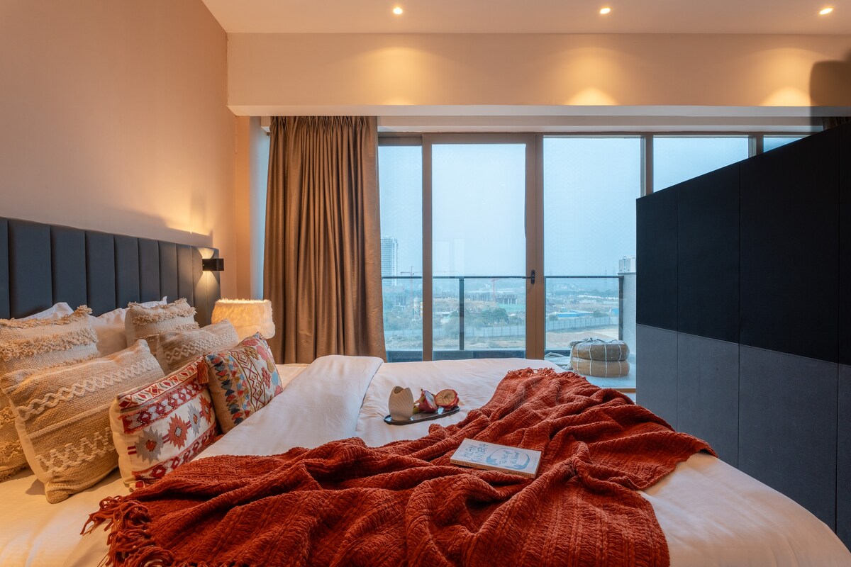 Rhythm by Lumen Leaf Wake up to serene sunrise views over the Aravalli Hills and unwind as the city skyline glows at sunset. This luxury suite blends modern elegance with cozy warmth — featuring a king bed, sofa-cum-bed, elegant bar cart, ambient lighting, and chic décor. Designed for both relaxation and celebration, it’s party-ready yet peaceful, offering modern amenties, and curated details that make every corner photo-worthy. Located just 5 mins from Worldmark Mall and 20 mins from Cyber City