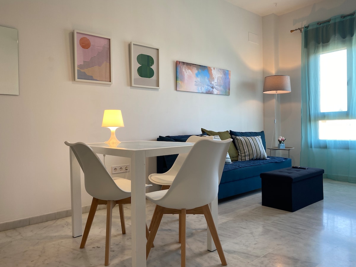 Cozy apartment for 4 guests, with 1 garage space, 12 minutes by car from Seville's Historic Center or, if you prefer to take a bus, 20 minutes (the stop is 8 minutes on foot). Comfortable living room with fully equipped kitchenette, spacious bedroom with 2 beds and sofa bed two seats in the living room and large bathroom. It has a swimming pool. Building with 24-hour reception and Wi-Fi. Supermarket, cinemas and restaurants 1 minute walk away.
