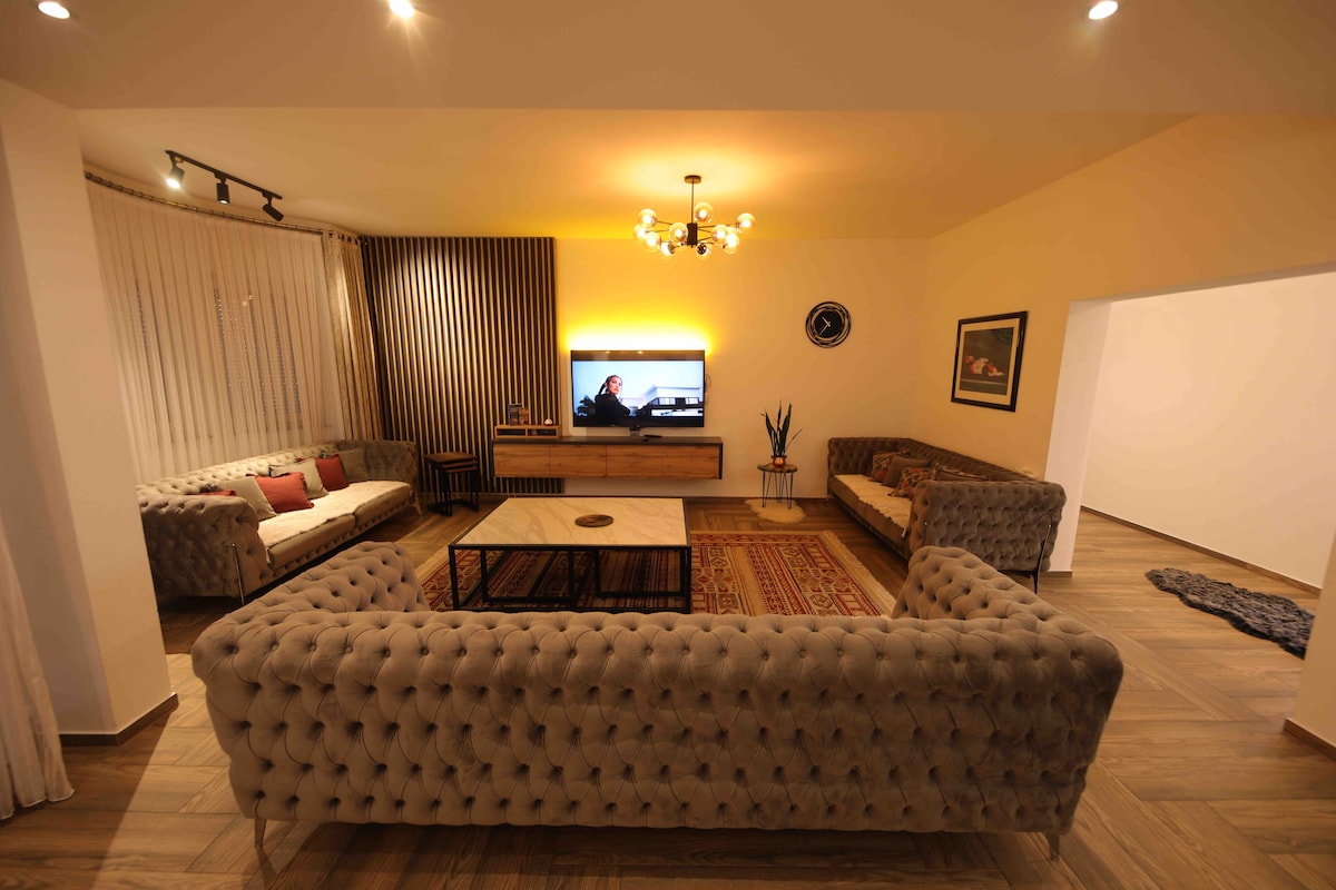 Stay cool with our new air conditioner! In the heart of Prishtina, just 10 mins from the main square, this bright apartment has a large terrace with city views, two modern bathrooms, three cozy beds, a fully equipped kitchen, and a spacious living room with comfy sofas and a 42" TV with Smart Box (Netflix,Hulu,Music) Perfect for relaxing, exploring, or working remotely in comfort and style!