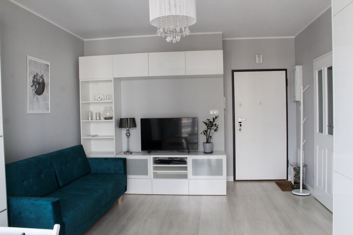 Comfortable, fully equipped apartment in a new building. A living room with an open kitchen divided into a dining and sitting area. The bedroom has a queen bed and a spacious closet. There's also a walk-in closet as an extra storage space. There are shops, restaurants and cafes in the area Equipment: air conditioning, coffee maker, kettle, iron, ironing board, washing machine Directions from Chopin Airport 20 min taxi 50 min communication from Modlin Airport 50 min taxi 120 min communication