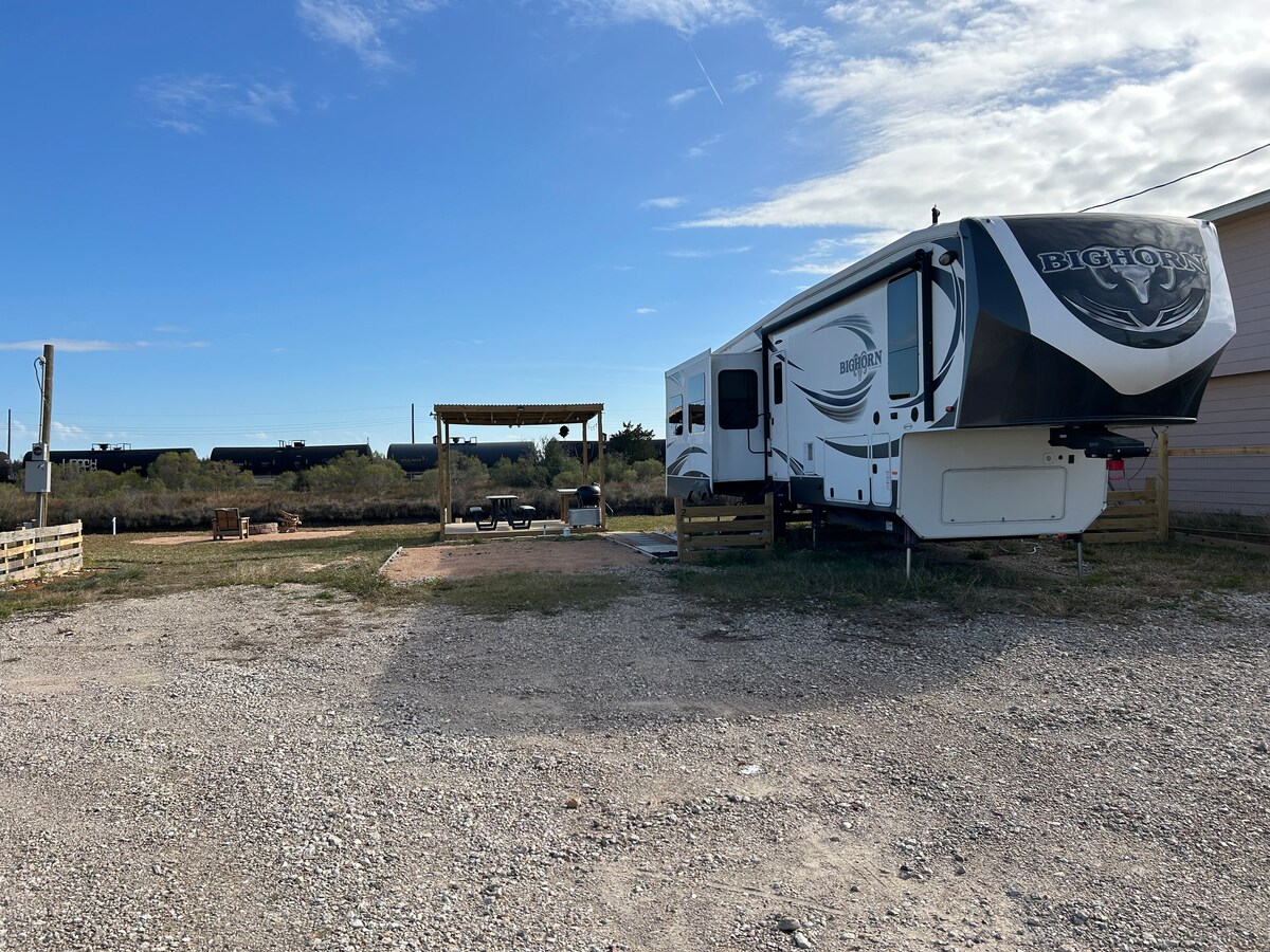 Beautiful new camper. Very clean. Large cover over camper and large concrete pad. The cover will provide some relief during the Texas heat and a cover for any rain. Fish and crab right out the back door.There is a brand new 10 x 16 and 10 foot high deck to go out on and watch the barges, pelicans,shore birds and the sunsets! The site has a fire pit with a grill on top of it to cook on. Pull your boat up to the back of the campy.Queen size bed when you are ready to turn in!