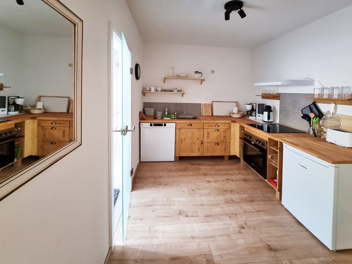 After the biological renovation, six high-quality furnished vacation apartments and a chalet open their doors. For guests with a conscious lifestyle, an oasis in an idyllic and quiet natural environment has been created here. Each apartment has a fully equipped kitchen and very high-quality interior. Equipped with natural wood furniture and textiles, we offer you a stress-free and healthy break from everyday life. You can also reach us by public transport.