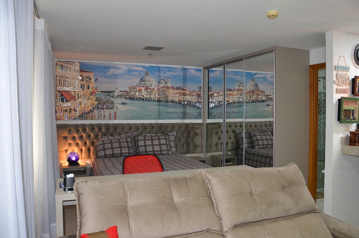 Um Loft Studio amplo de 50 metros2, planta baixa aberta, proporciona liberdade e conforto, 1 cama de casal, 1 sofa que acomoda tambem, Aproveite o acesso fácil a tudo o que precisar nesta acomodação bem-localizada, ao lado do Parque Flamboyant (lindo Parque com areas verdes, 2 lagos, pista de corrida e de ciclismo), em frente ao Estádio Serra Dourada onde acontecem grandiosos eventos e bem próximo ao Shopping Flamboyant e do Centro Cultural Oscar Niemeyer onde também acontecem Shows e eventos.
