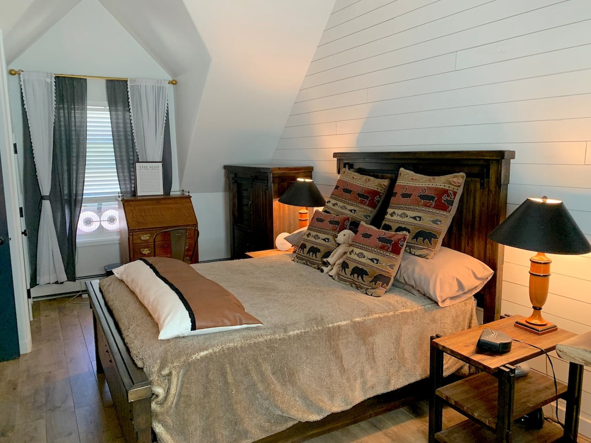 Private completely renovated two bedroom cottage located in the heart of Golden. This home comfortably sleeps six with three queen beds. The second bedroom has a queen over queen bunk bed. The master bedroom suite includes a private bathroom and a separate private sunroom attached. This is perfect extra space for meditation, a baby room, or an extra guest. The home has a private patio with a large oversized BBQ, a picnic table that seats 8 and a cushy love seat under the covered porch.