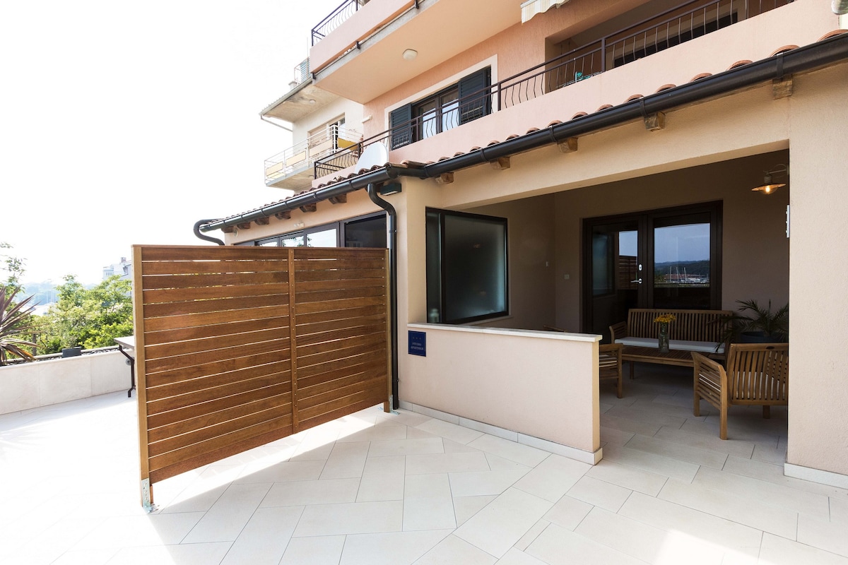 Beautiful, new renovated apartment, with sea view and perfect location. 1km from city center, 800m from most beautiful beaches. The apartment (44m2) consists of large open plan living / dining room with fully equipped kitchen and sofa bed, large bathroom, bedroom with king size bed and large private terrace. Free WI-FI, several international TV channels, air conditioning.