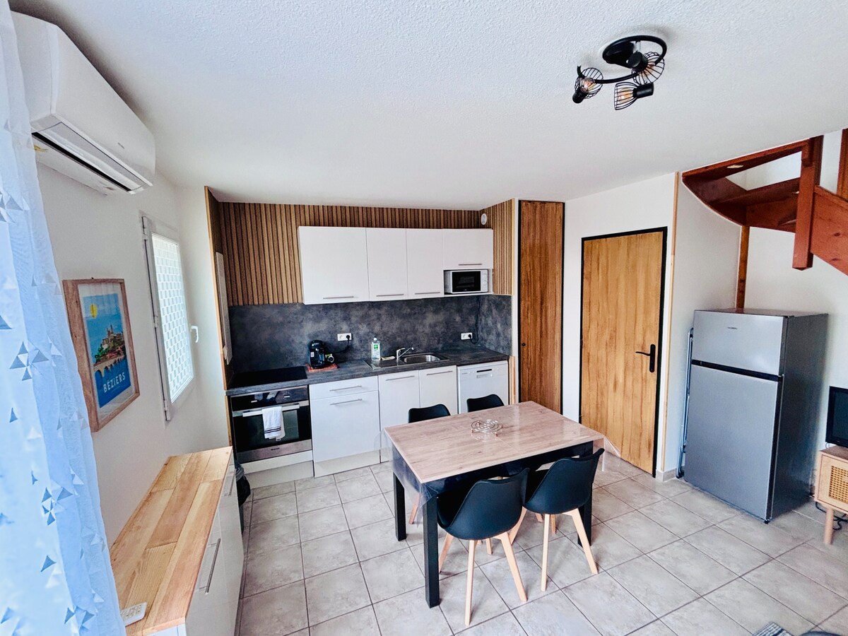 On the banks of the Canal du Midi, 15 minutes from the beaches, stay in a vacation home in a private residence. Quiet and wooded place. Summer pool/Heated winter pool. Renovated 40 m2 T2Bis. Small private garden with terrace. Ground floor: living room with equipped kitchen (dishwasher, oven, induction, Tassimo, TV...), toilet. Upstairs: 2 bedrooms (double bed/bunk beds) + bathroom. Sheets and towels are provided. €15 discount if you bring your own. To be specified before check-in.