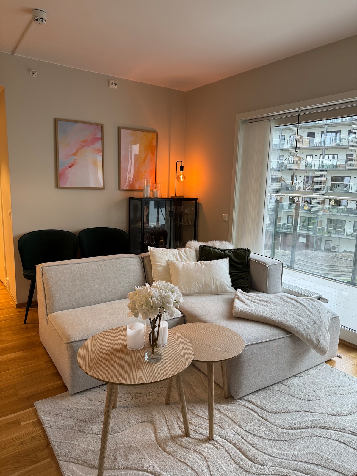 Apartment of 40 sqm with kitchen, living room, bathroom and two bedrooms, as well as sofa bed in the living room. The apartment includes a garage space. The apartment is in the immediate vicinity of the store and bus stop. The bus takes 15 minutes to the city and runs every ten minutes during rush hour. The apartment has a veranda with outdoor furniture + barbecue, and is covered with a roof. Short distance to Estendstadmarka and Ikea, and the apartment is easy to get to from E6.