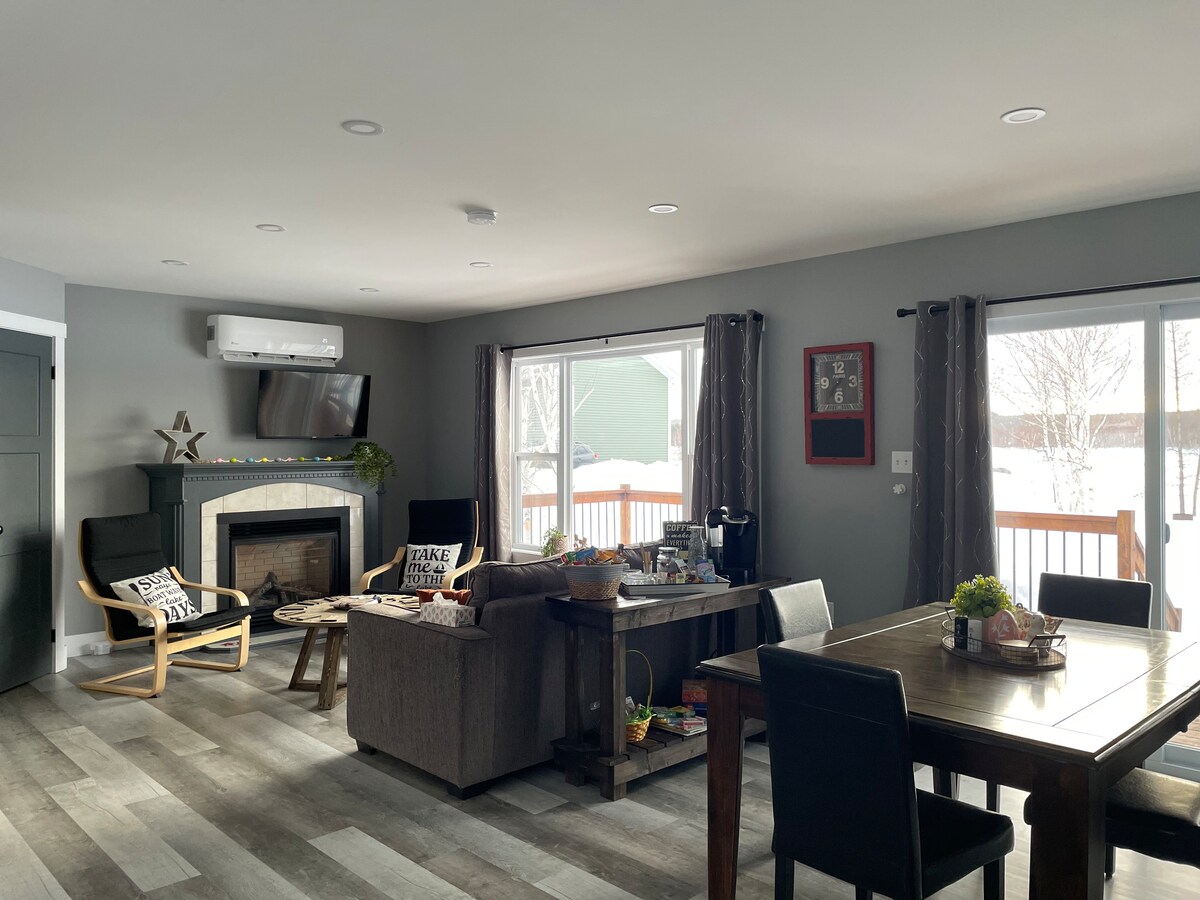 Located in the heartbeat of downtown Grand Falls-Windsor! This newly renovated apartment overlooking High Street delivers above and beyond. The latest in Panasonic Air Conditioning, a fully equipped kitchen, fiber op internet/wifi, King and Queen bed, and a 60-inch TV with Fibe TV will bring you back to the comforts of your own home. A few litle extras are the purified water cooler and multi-colored fireplce to help you relax in the late evening hours.