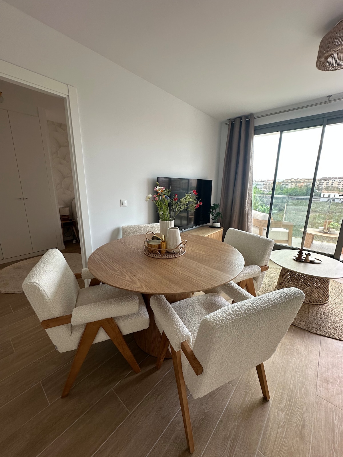 - Magnificent development 450 meters from the beach - 5 outdoor pools with jacuzzis and heated pool, paddle tennis, tennis, basketball and soccer courts, barbecue area, covered parking space, children's area, gyms and saunas (1 euro per hour for sauna use) - Fourth floor with a large terrace overlooking the mountains and swimming pools in an area away from nightlife, ideal for families with children - Fully equipped kitchen and living room with a sofa bed for two people.
